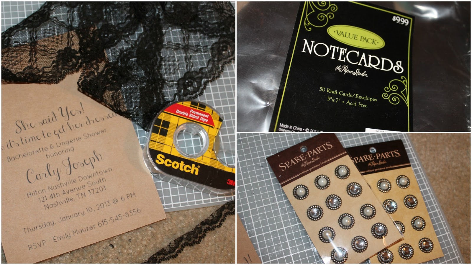 To Hobby Lobby I went for: Lace, craft paper, envelope/card pack, double-sided tape, ribbon, craft jewels, & paper doilies!